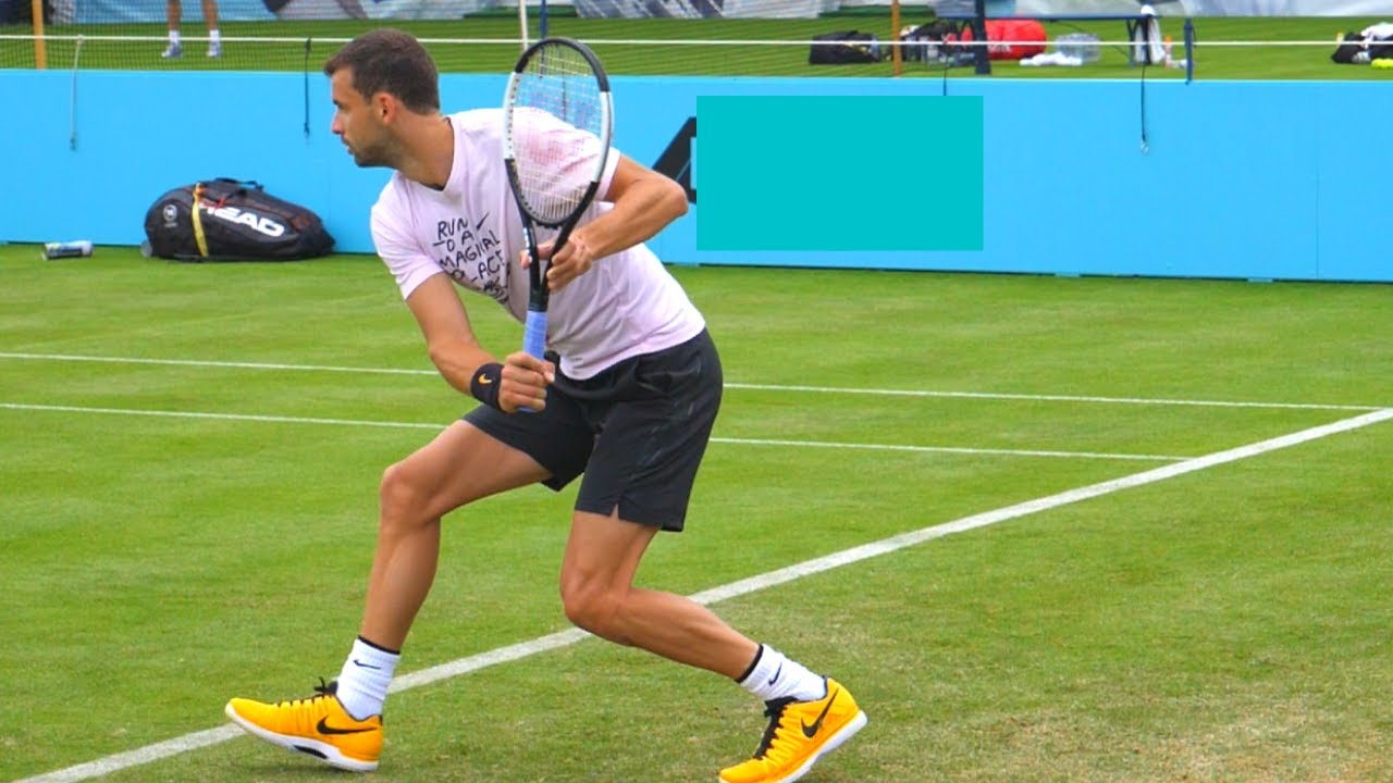 Op onderstaande foto is goed te zien hoe Grigor Dimitrov het topje van zijn racket omhoog laat wijzen voordat hij de bal raakt.